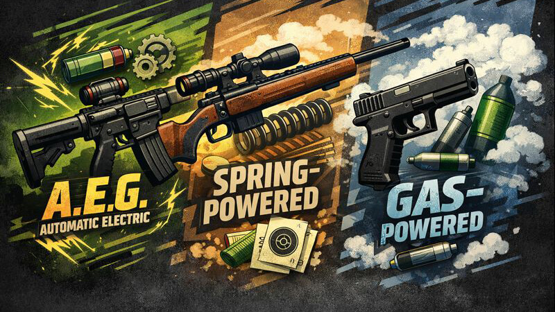 Choosing the right airsoft gun starts with knowing how each type works. Most airsoft guns fall into three main categories: AEG, spring-powered, and gas-powered. Each has its place, depending on how and where you plan to play.