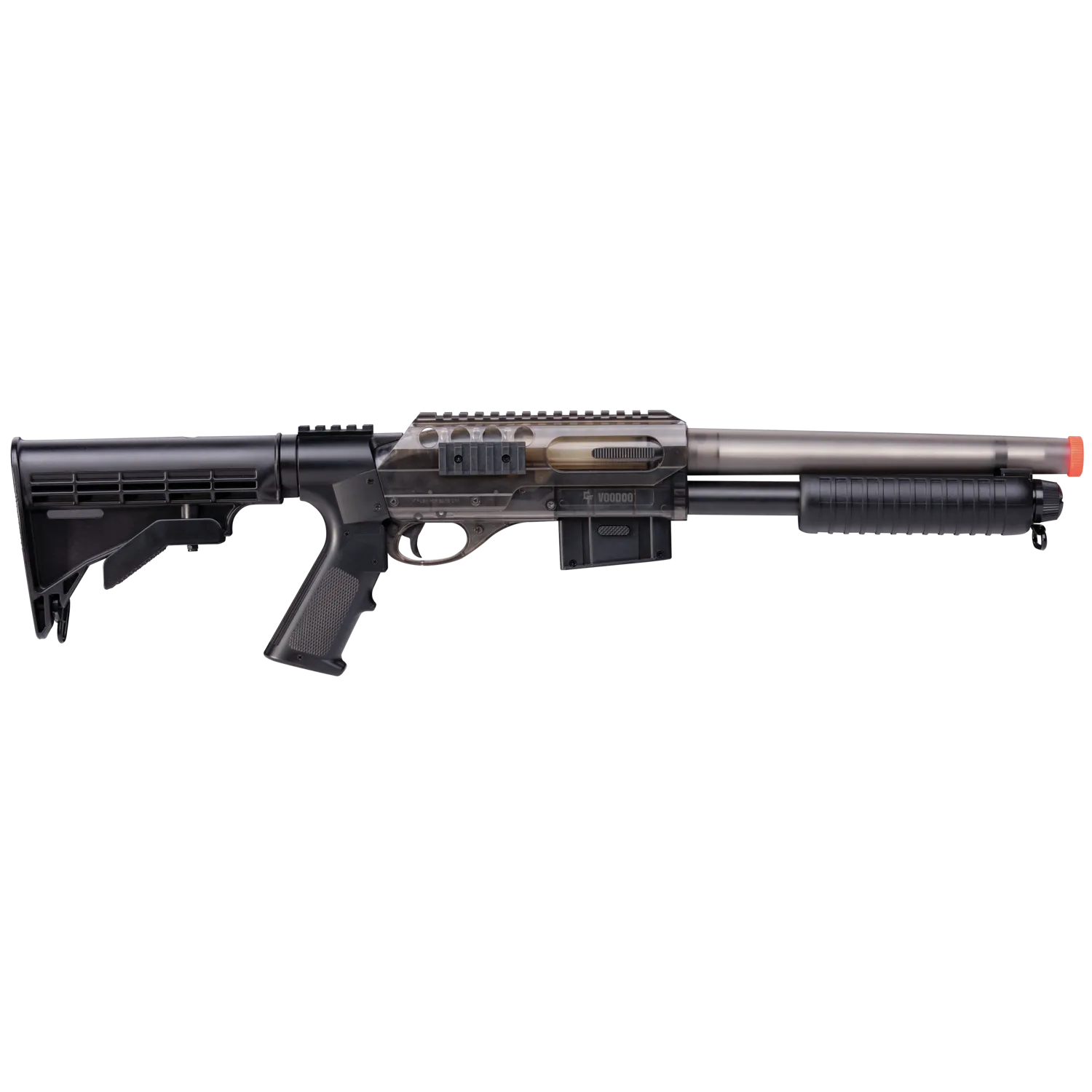 The shotgun-style platform includes a Picatinny mounting rail, allowing players to add compatible optics or accessories as their setup evolves. Built with a durable synthetic body, the VooDoo Smoke features a translucent “smoke” finish, meaning the polymer is partially see-through with a dark, smoked effect that reveals internal components without sacrificing a tactical look.